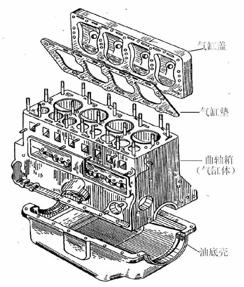 組成:汽缸蓋、汽缸體、曲軸箱、油底殼