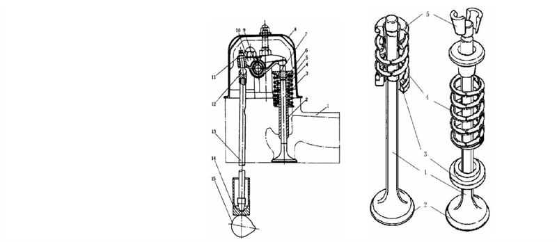 配氣機構組成:由配氣凸輪軸、挺柱、推桿、搖臂、搖臂座、氣門、氣門彈簧及其附件組成。