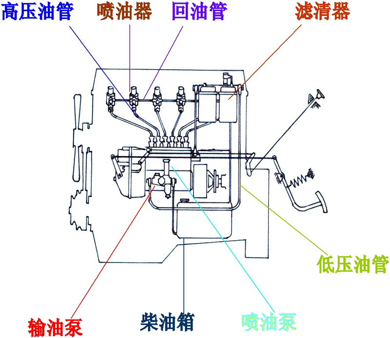 組成: 燃油供給系統(tǒng)由噴油泵、調(diào)速器、輸油泵、燃油濾清器、噴油器、高壓油管、低壓油管及其附件。