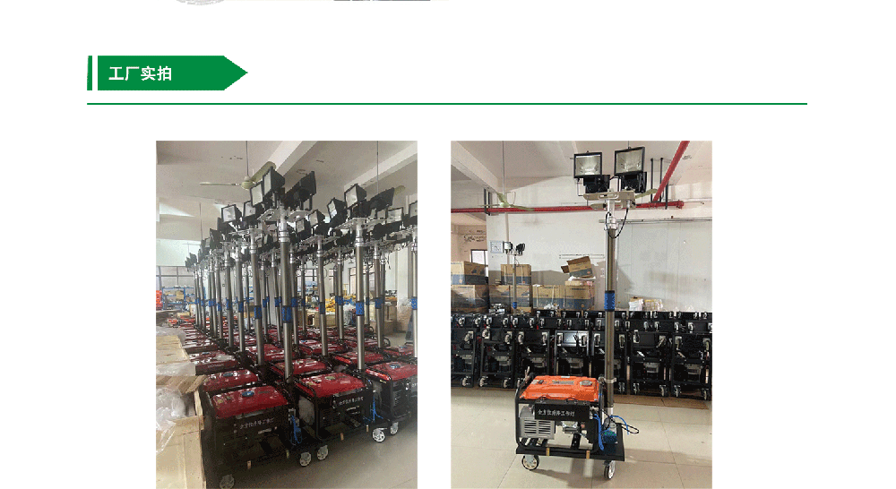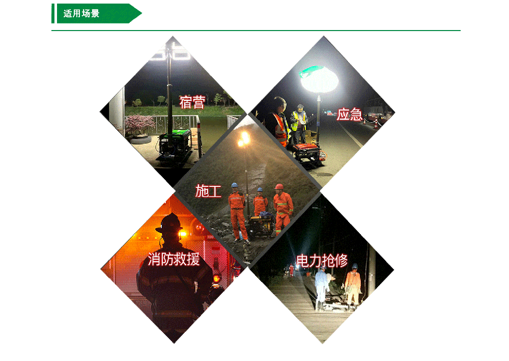 各種夜間作業(yè)如大型施工、工程搶修、災(zāi)情搶險(xiǎn)、消防照明、警案現(xiàn)場(chǎng)、交通拯救、事故處理和廣告拍攝等場(chǎng)合,滿足了現(xiàn)場(chǎng)對(duì)大面積、高亮度照明的需求。